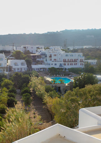 Resort movimentado na Praia Platis Gialos, com tabernas à beira da baía, esportes aquáticos e trilhas nas encostas.